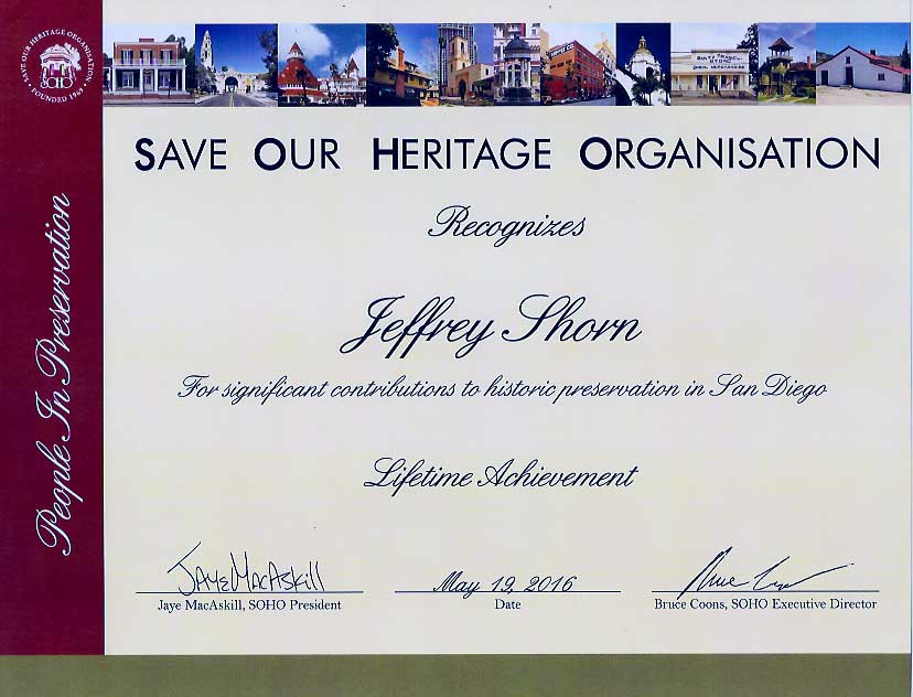 In San Diego, Mr. Shorn's activities has encompassed a wide breadth of involvement: former Dean of the Newschool of Architecture, a past member of the City Manager's Seismic Retrofit Committee, a much respected eight year member of the San Diego Historic Resources Board, a consultant to the Sherman Heights Historic Rehabilitation Program, the El Cajon Boulevard BIA storefront improvement program and Vice President of Save Our Heritage Organization (SOHO).